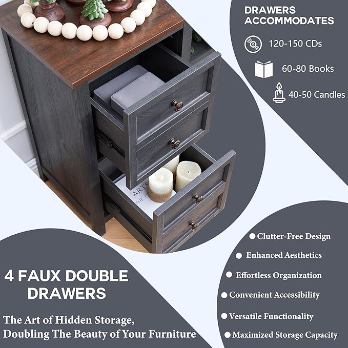 - 【Farmhouse Design】Elevate your living space with our farmhouse-inspired fireplace entertainment center featuring four faux double drawers. Each drawer is adorned with elegant round handles, adding a touch of sophistication to the rustic charm of the piece. The combination of the faux double drawers and the graceful round handles creates a harmonious balance of style and practicality. Transform your space into a harmonious blend of elegance and functionality.