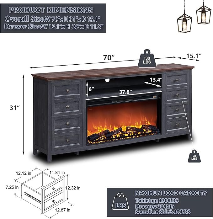 - 【Fireplace TV Stand Dimensions】31" H x 70" W x 15.1" D, Fits TVs up to 80 inches (TV Stand with Fireplace for 75+ 75 70 65 Inch TVs etc.) Drawers Dimensions: 7.25" H x 12.21" L x 11.81" D.