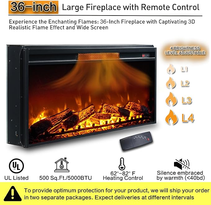 - 【36" Electric Fireplace】The perfect marriage of a 3D realistic effect wood fire flame and farmhouse style is found in the fireplace TV cabinet. With a generous 36-inch widescreen, this electric fireplace takes the ambiance of your living room to the next level. The remote control allows for seamless adjustment of the flame size across 4 settings, while the impressive 5000 BTU capacity provides coverage for up to 500 square inches. Embracing green energy, enjoy low carbon living.