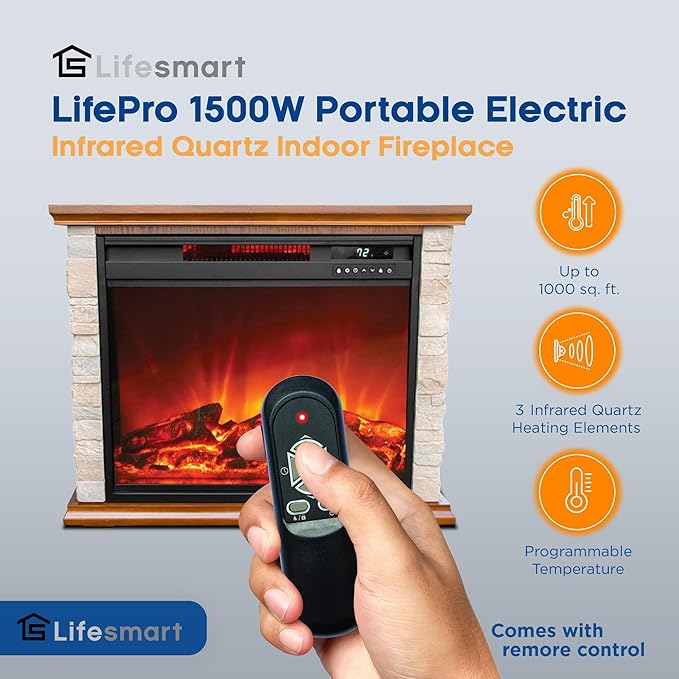 LifeSmart Electric Fireplace Heater, 1500 Watts, 3 Heating Elements, Faux Stone & Oak Wood