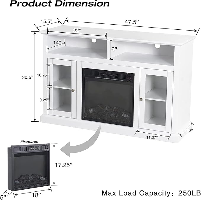 - Dimensions: Cabinet 47.5"(W)x15.5"(D)x30.5"(H) inches, insert electric fireplace 18"(W) × 5"(D) × 17.25"(H). The TV stand supports up to a 55" flat panel TV with a maximum top load capacity of 250 lbs.