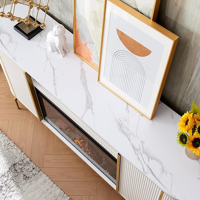 - 70 "LARGE LUXURY FIREPLACE TV STAND: The distinctive wave-like fluted panel and Curved Profile Design makes it can be effortless paired with other modern furniture styles. The White/Navy Blue/Natural Oak faux marble top replicates natural marble patterns, maintaining a sense of luxury while reducing weight. Golden metal accents add a touch of visual opulence, and the warm golden tones bring a cozy atmosphere to the room, making it your ideal modern luxury piece for the living room.
